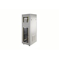 lichtgrau (RAL 7035), 36 HE Einbauhöhe, zwei verschiessbare Frontglastüren und eine abschliessbare, ausziehbare Tastatur- schublade, Schutzart IP 40, bis 500 kg Ladekapazität, vor- dere und hintere 19" Ebene tiefenverstellbar, 4 Nivellier-